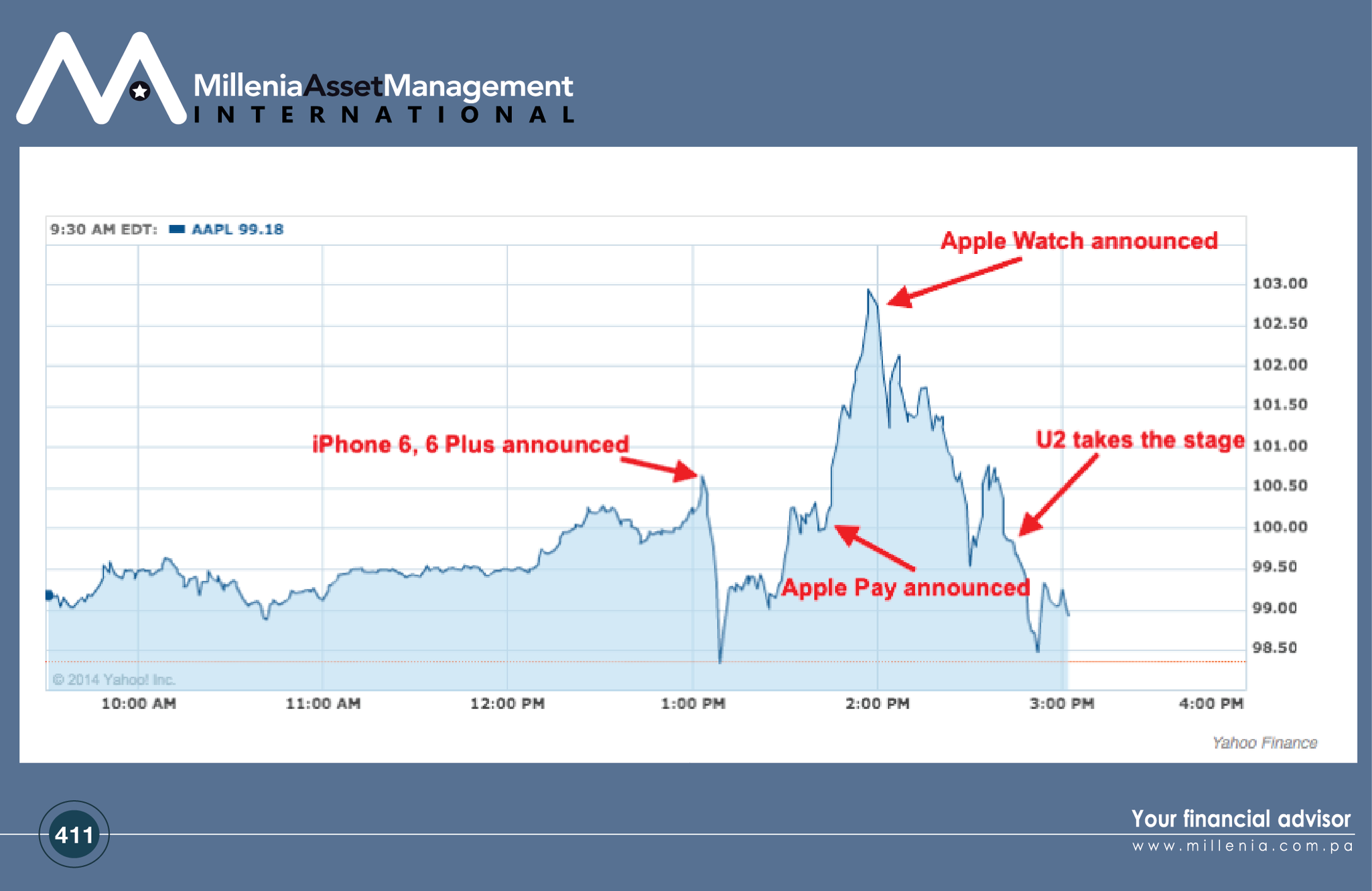 The second red tag reads, "Apple Pay announced." The market took this as the starting gun for a sharp upward move, an upward move that continued right up until the announcement of the new Dick Tracey style Watch. That third tag says "Apple Watch announced." That's when the price headed down again in a big way. Even U2 taking the stage (the fourth tag) didn't calm people down much, and the price almost got back to the earlier session low again before stabilizing and gaining some ground back.